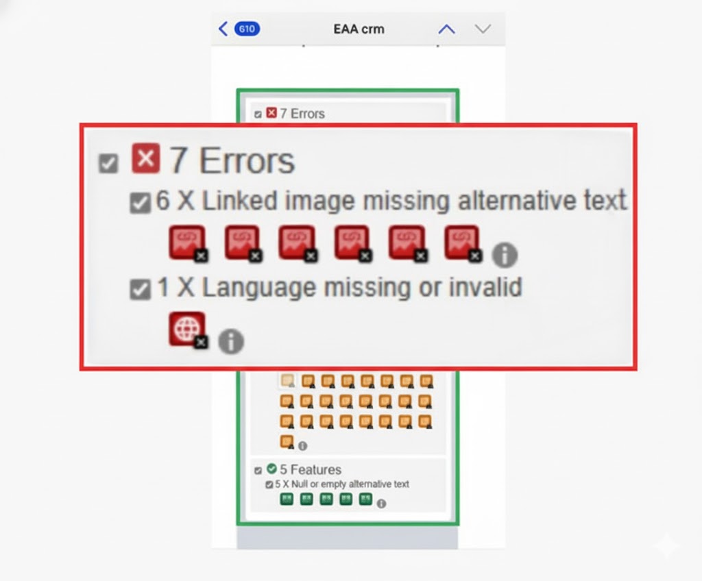 Recomandat este să folosiți cel mai potrivit tool pentru a testa accesibilitatea unui email. Un astfel de tool vă va oferi un raport, precum cel din imaginea alăturată, cu problemele de accesibilitate identificate.