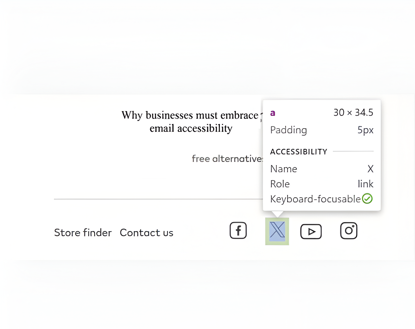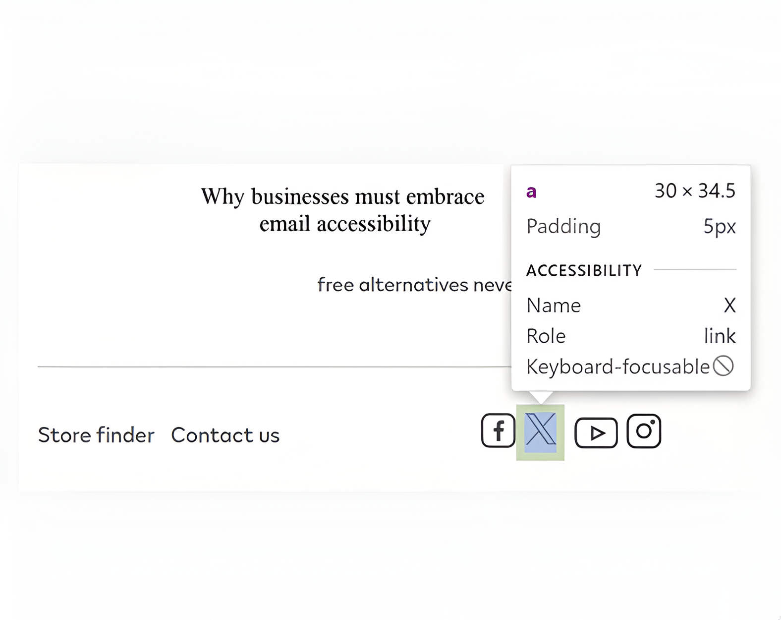 În exemplul de mai sus, iconițele de social media sunt foarte apropiate, iar linkurile nu sunt accesibile din tastatură.